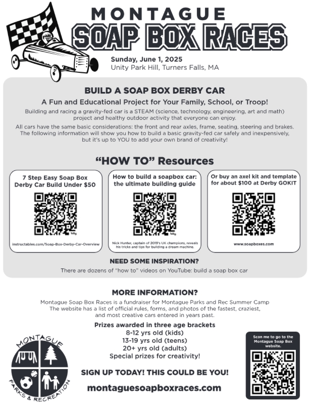 LOOKING FOR VOLUNTEERS!! -- The Montague Soapbox Derby needs volunteers on race day to help set up the race track, check in racers, crew on the television production, and more! Sign up using the volunteer form, below.